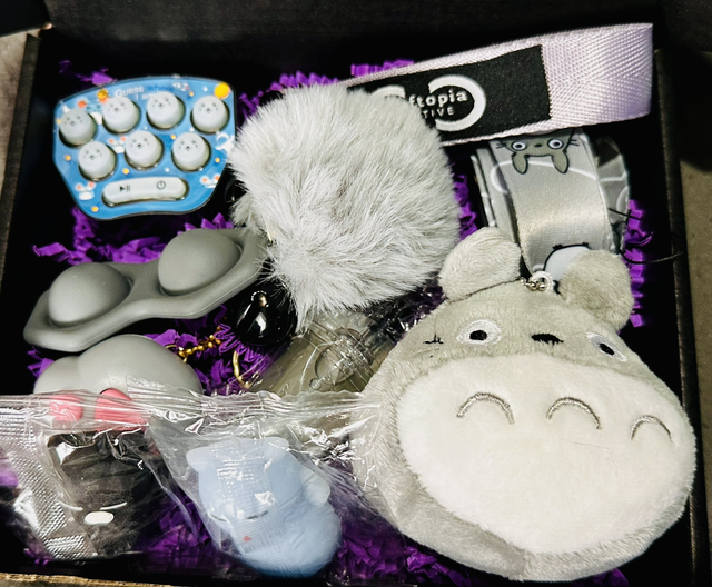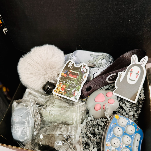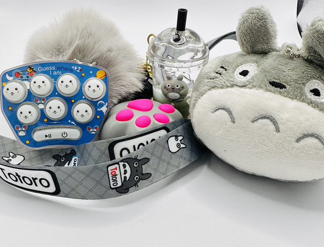 This anime sensory keychain & lanyard plushie gift set is perfect for any anime lover! The Totoro plushie keychain is bundled with a popit LED clicker torch, fluffy Pom Pom, and small squishy toy. The Totoro boba cup custom wrist lanyard adds even more convenience to this bundle.